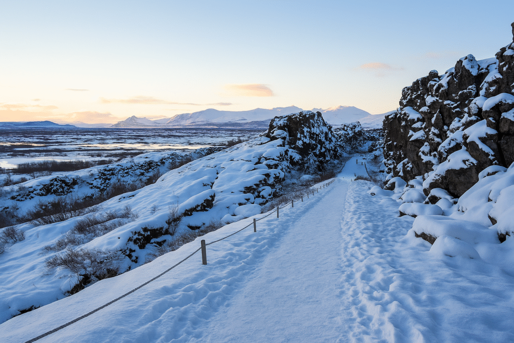 (📸“Thingvellir National Park winter view with snowy path and rift valley”)