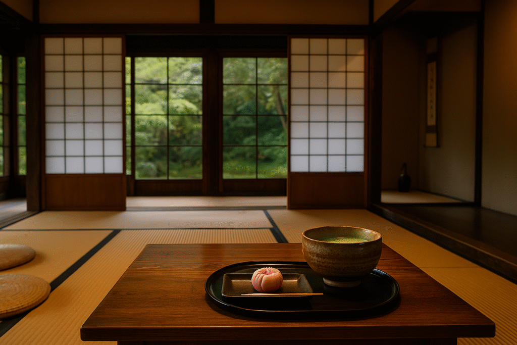 (📸“Traditional Japanese tea house interior with matcha and wagashi in Kyoto”)